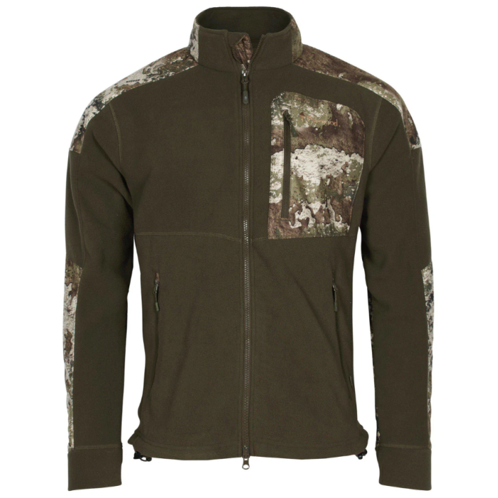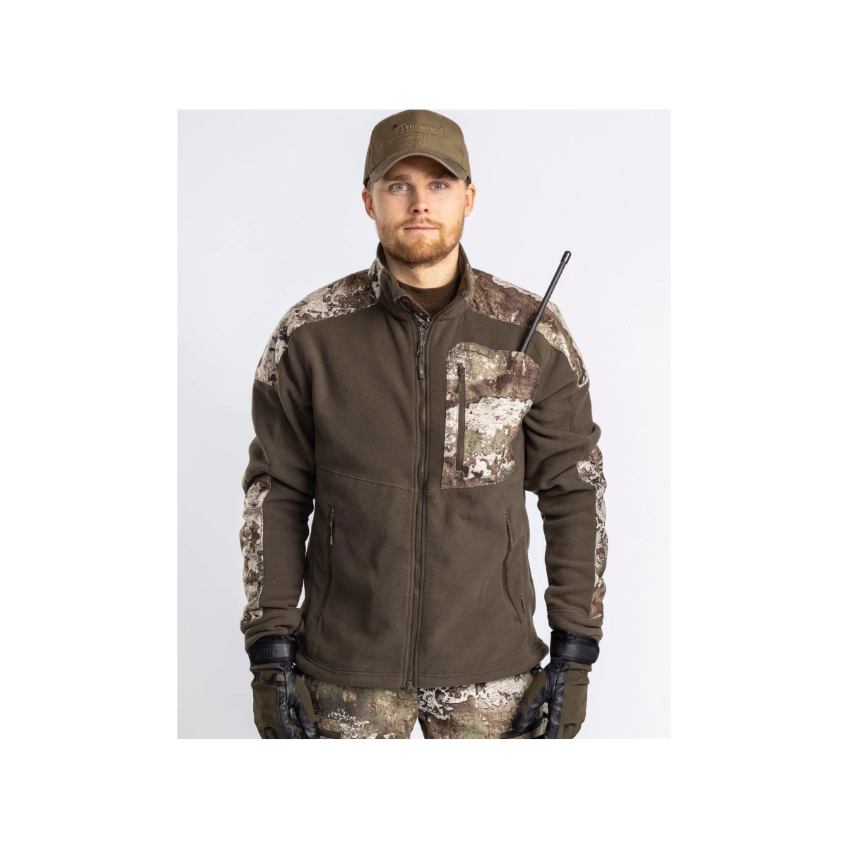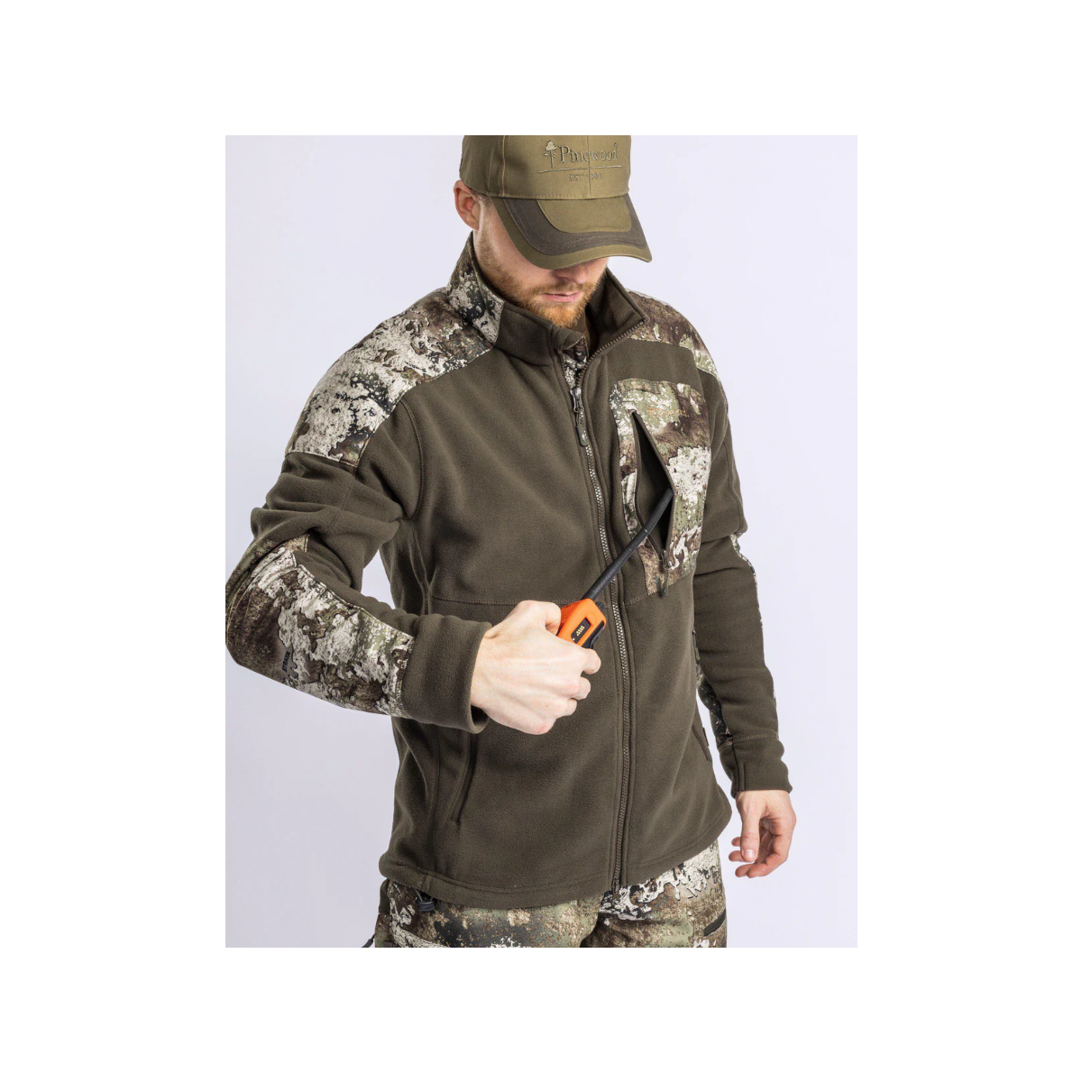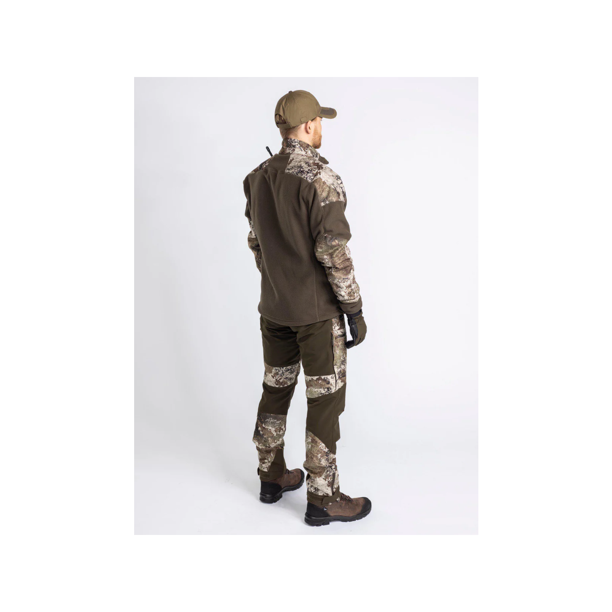 Flis jakna iz recikliranega poliestra z nepremočljivimi vložki na ramenih, prsih in podlakteh iz 2-slojne laminirane kamuflažne tkanine, ki vas ščiti pred mokroto, ko se prebijate po terenu. Jakna iz flisa ima žepe za roke z zadrgo, kamor lahko varno shranite svoje stvari, ter prsni žep z odprtino za anteno. Za tesnejše prileganje spodaj lahko spodnji del flisa prilagodite z vrvico. Zaradi mehkega flisa je jakna tiha in popolna za prikriti lov. Jakno lahko nosite vso jesen, bodisi kot vrhnje oblačilo v toplih dneh ali pod jakno, ko pride hladno vreme.